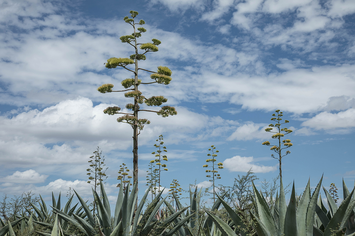 Recorriendo el estado de Hidalgo, en una estancia corta por el pintoresco pueblo de Tecozahutla, recorría sin prisa y sin rumbo definido una carretera que conecta con el pueblo vecino llamado Bothé. Era medio día y vislumbré un paisaje a lo lejos, aunque muy mexicano, nunca había visto algo parecido. Era un campo de magueyes, una hilera enorme con decenas de ellos en flor, es decir, con sus quiotes de más de cinco metros de altura en todo su esplendor. Es poco común ver un paisaje así, ya que los quiotes salen del centro del maguey cuando no ha sido extraído el aguamiel en los ocho o diez años que tarda en madurar el agave. Néctar de los dioses que hace explotar el tallo de manera vertical, como queriendo tocar el cielo, alcanzando los diez metros de altura justo cuando la planta está a punto de morir.