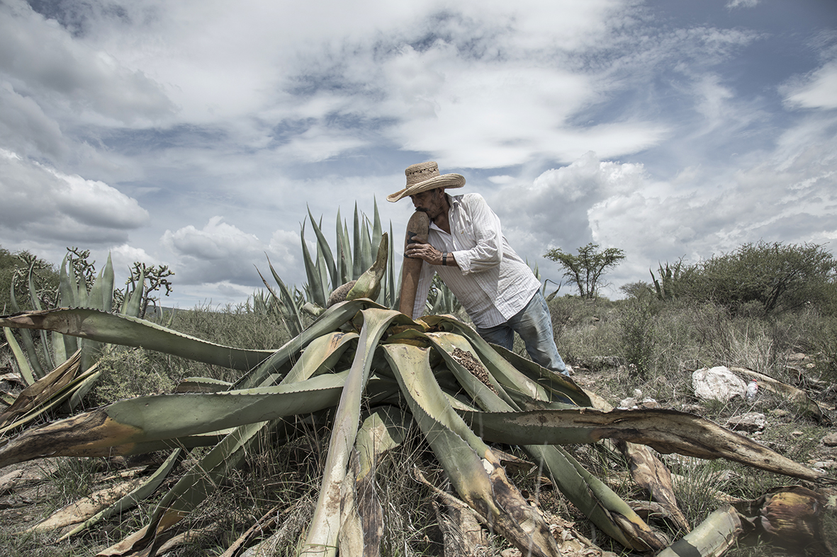 Después de unos minutos de conversación introductoria, Juan me invitó a ver cómo “raspaba”. Así se conoce a la tarea de recolectar el aguamiel, debido a que inmediatamente después de haber chupado el delicioso néctar cual colibrí ayudado del largo guaje, se raspa la pulpa con una espátula de metal para estimular el siguiente ciclo de secreción del delicioso líquido. Esto lo hacen cuatro veces al día, incluso a veces en las noches. Así recorrimos cinco o seis de esos magueyes, pertenecientes todos a su terreno de varias hectáreas, donde tiene su casa y donde también planeó y construyó la casa de uno de sus hijos, en medio de la nada, o mejor dicho, de ese todo que implica aquel valle rodeado de montañas y cielos espectaculares.