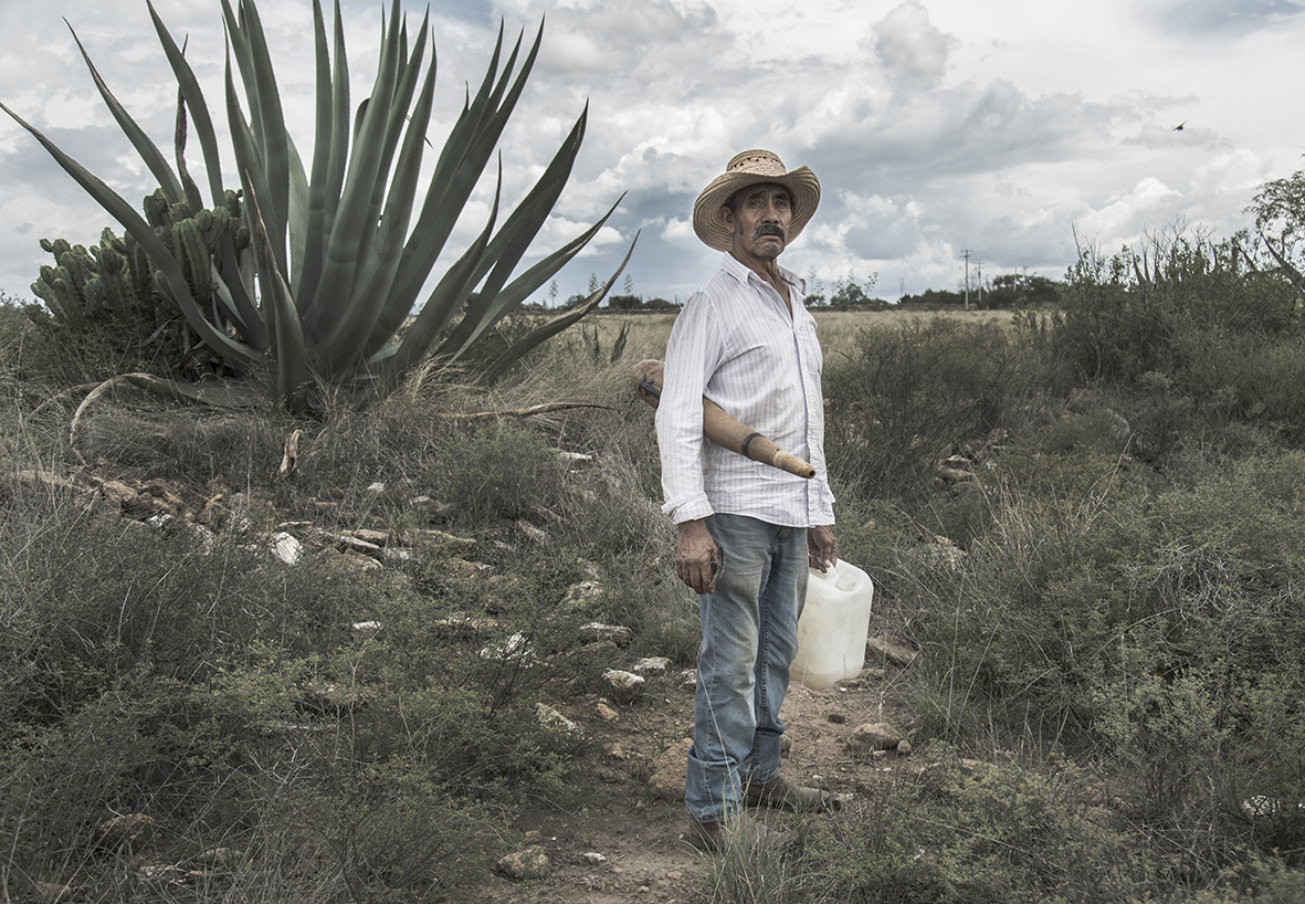 En esas andaba cuando ví aproximarse entre los magueyes a un señor recio aunque delgado, aparentemente serio, con sombrero, botas de trabajo y bigote de setenta y dos años según me contó más tarde. Tan mexicano como la planta que nos rodeaba. Cargaba un bidón de plástico y un hermoso guaje con el que se extrae succionando, el aguamiel. No era difícil adivinar el propósito de su presencia. Así que me presenté tímidamente, intentando disculparme por mi intromisión pero no fue necesario dar muchas explicaciones, ya que su gesto amable y sonrisa franca hicieron que me sintiera bienvenido. ¿Qué otro nombre podía tener un hombre mexicano humilde, que no pobre, si no el de Juan? Juan Ramírez Mentado. En Hidalgo mucha gente tiene apellidos curiosos como el materno de Juan, y también hay quienes se apellidan Disciplina o Comunidad.