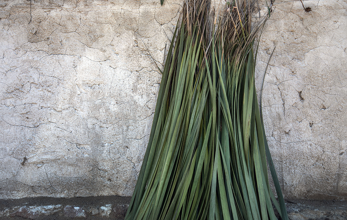En el proceso del tejido, las hojas recrean formas geométricas insospechadas, con cruces y largos picos, que bien podrían ser piezas de arte por sí mismas, antes incluso de terminar como cestos o canastos. El color verde intenso cuando está recién terminada la pieza, se va transformando con el tiempo en un amarillo ocre cuando la hoja se ha secado completamente. Ojalá conservaran el color original, pero al ser un producto natural, sufre la transformación de pérdida de color y textura original como cualquier otro material orgánico.