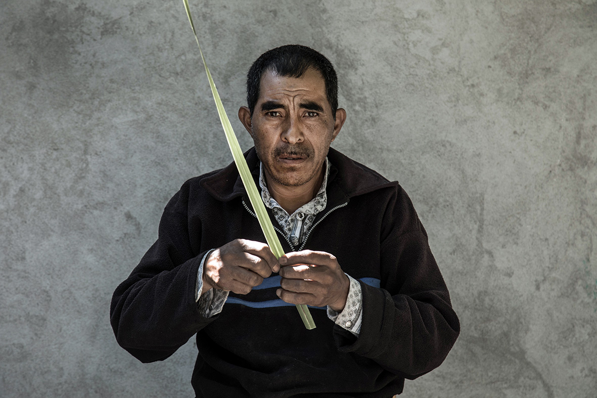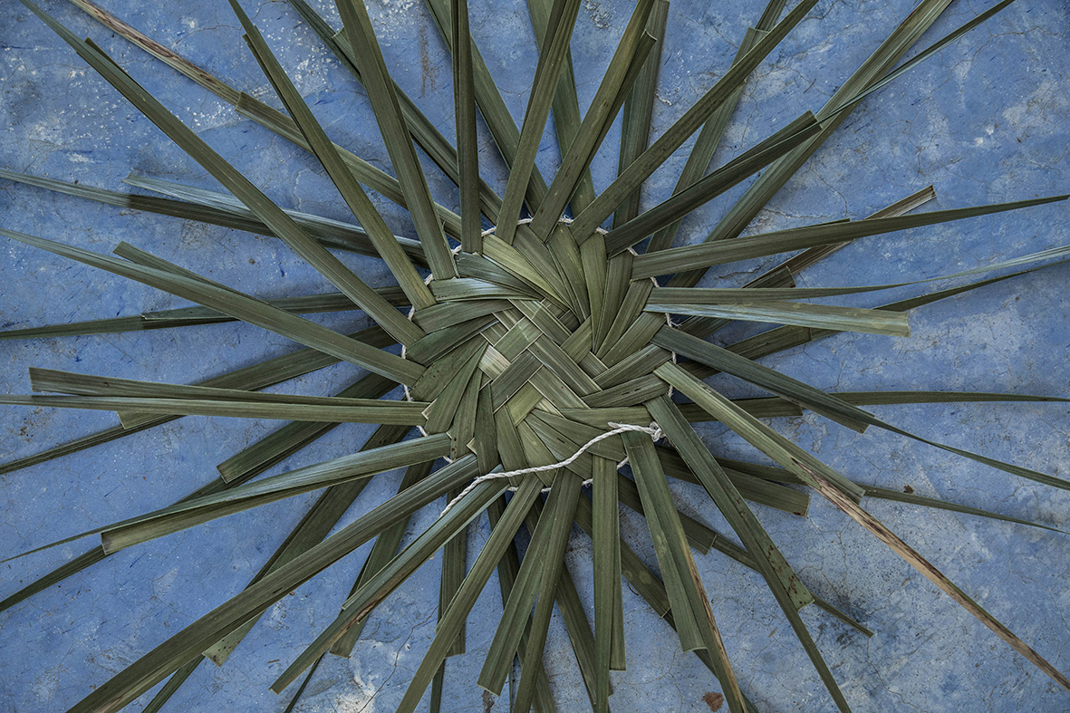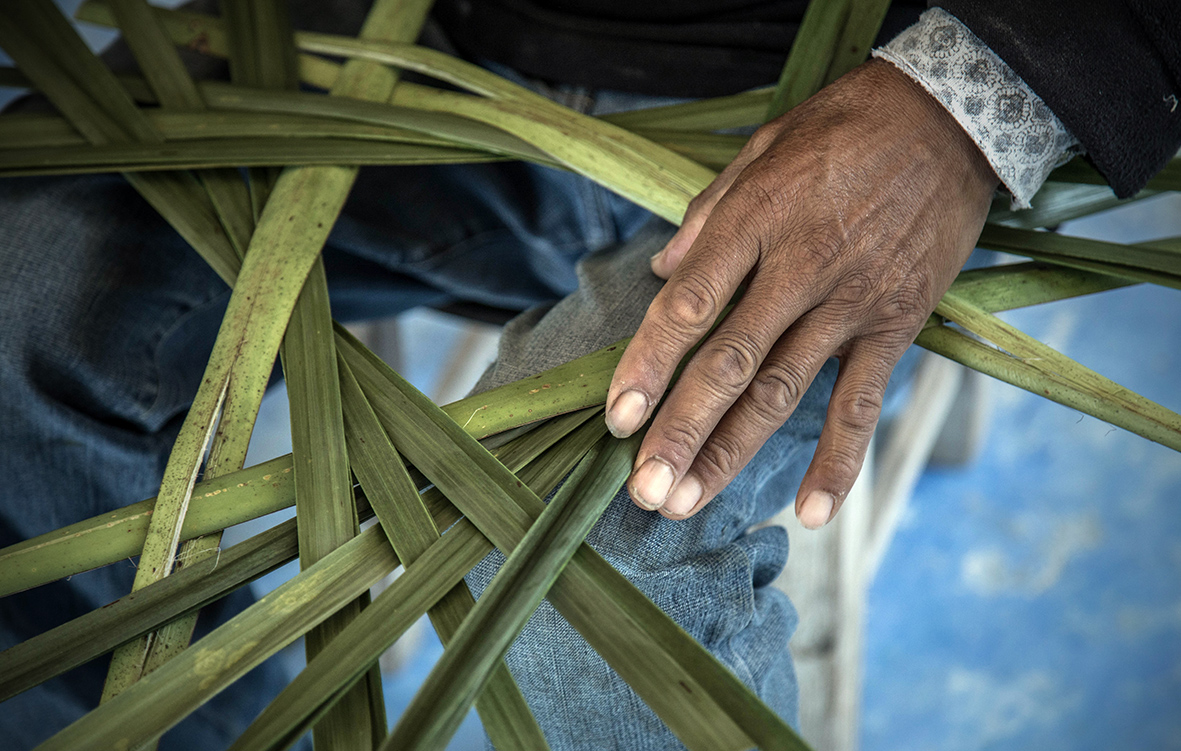 Una vez humedecida, Don Felipe se sienta en una sillita de madera para comenzar su tarea de tejido utilizando solamente sus manos y un pequeño cordón blanco para ayudarse en el sostén de la estrella que sirve de base de las cestas.