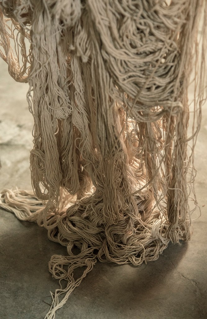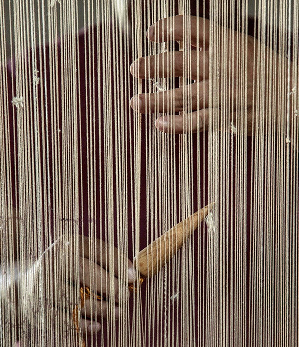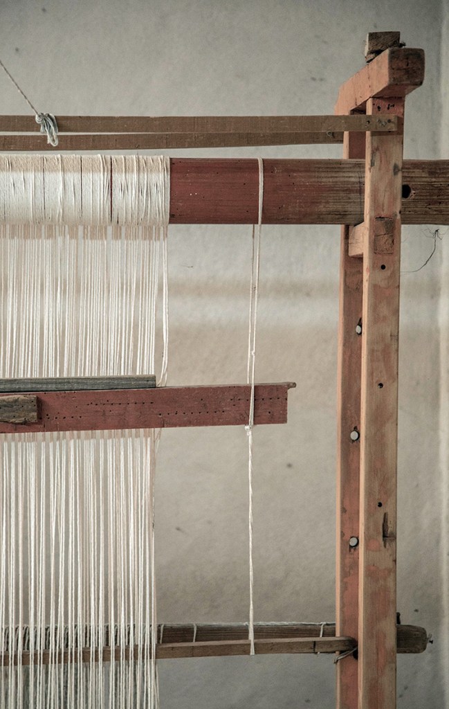 El telar vertical es singular porque la urdimbre está precisamente de forma vertical, y esto le brinda una estética especial ya que el artista queda oculto entre los hilos a manera de cuerdas de un arpa, asomándose solamente y de manera sutil las manos, que pasean las graciosas lanzaderas de madera para ir dándole forma a la trama.