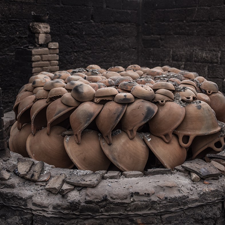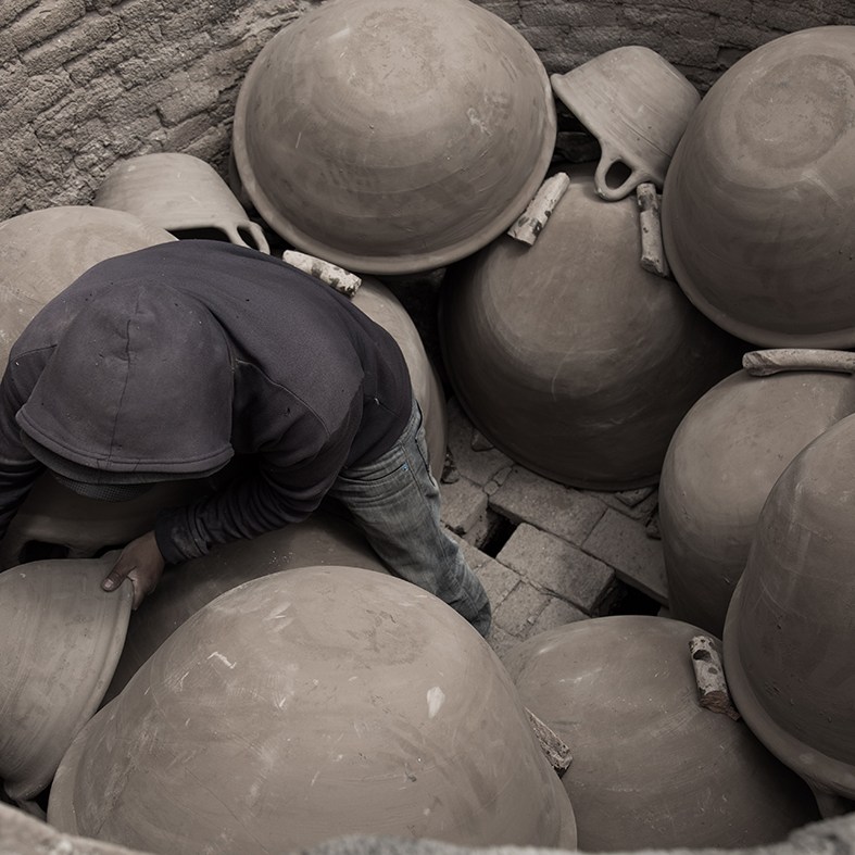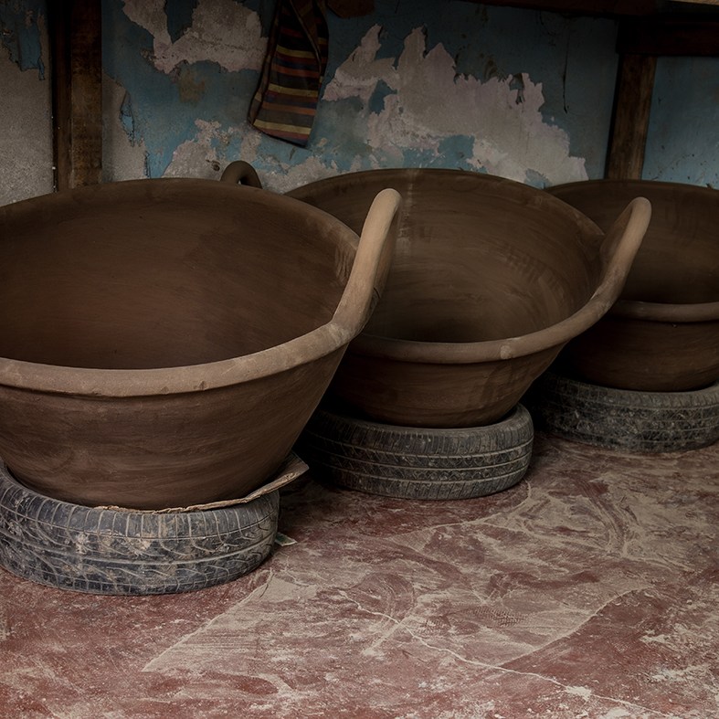 Hay talleres que adquieren el barro ya listo para ser utilizado en el torno. Este en particular, es un taller donde consiguen la materia prima en cerros no tan cercanos, y lo preparan en grandes piletas. Ahí mezclan la tierra con agua, la van colando hasta obtener ciertas cantidades de barro en masa para mezclarlo con piedras molidas a manera de fijador.