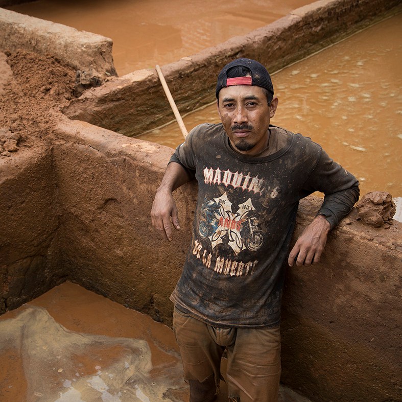 Un hombre se sumerge hasta la cintura en aquél líquido café, moviendo sus piernas con ritmos constantes y fuerza suficiente para hacer la función de una mezcladora. Una vez obtenida la masa de barro, la juntan en un cuarto especial para dejarla secar un poco, lo suficiente para que adquiera una textura un tanto más dura y puedan proceder a amasarla con los pies descalzos.