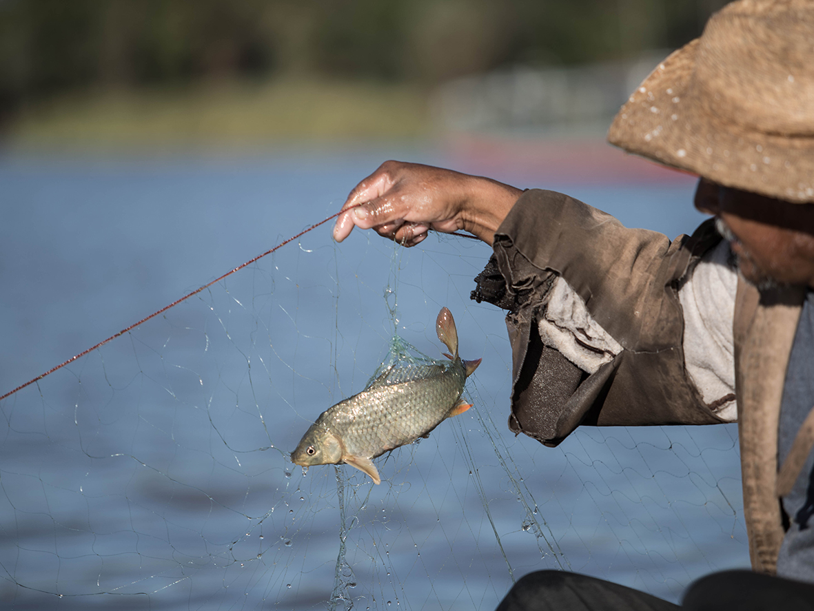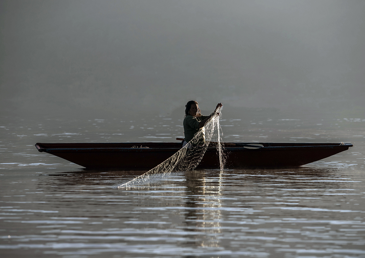 Aunque la práctica de la pesca es mayormente masculina, en la isla de Yunuen también hay mujeres que salen a pescar desde muy temprano. Tal es el caso de la señora Elpidia Castro, quien en solitario y sutiles movimientos, pareciera estar tejiendo una hamaca, más que realizando una tarea de pesca.