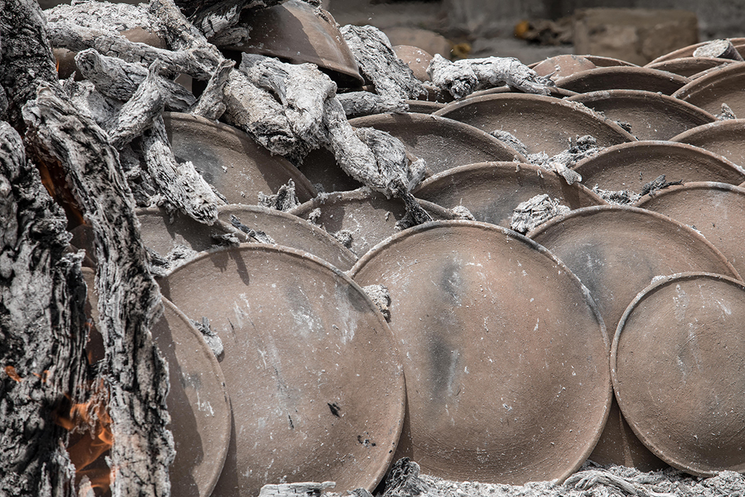 La estructura de fierro es una especie de rieles donde se colocan cuidadosamente los comales en ambos lados y encima algunas otras piezas. Una de las tareas más meticulosas, de las que se encargan las personas mayores, generalmente lo más ancianos, es la preparación de la cama de leña, la cual está conformada por diferente tipo de madera dispuesta estratégicamente según tamaño y tipo de leño. Todo esto conforma una estructura que asemeja una balsa o canoa, algún tipo de embarcación mítica hecha de discos de barro y leños de diferente tamaño. Es un espectáculo único, podría decirse que es una escultura perfecta realizada por los miembros de la familia participantes, quienes sin proponérselo, generan una pieza artística, más allá de los productos artesanales utilitarios. Eso sí, una pieza artística efímera e involuntaria.