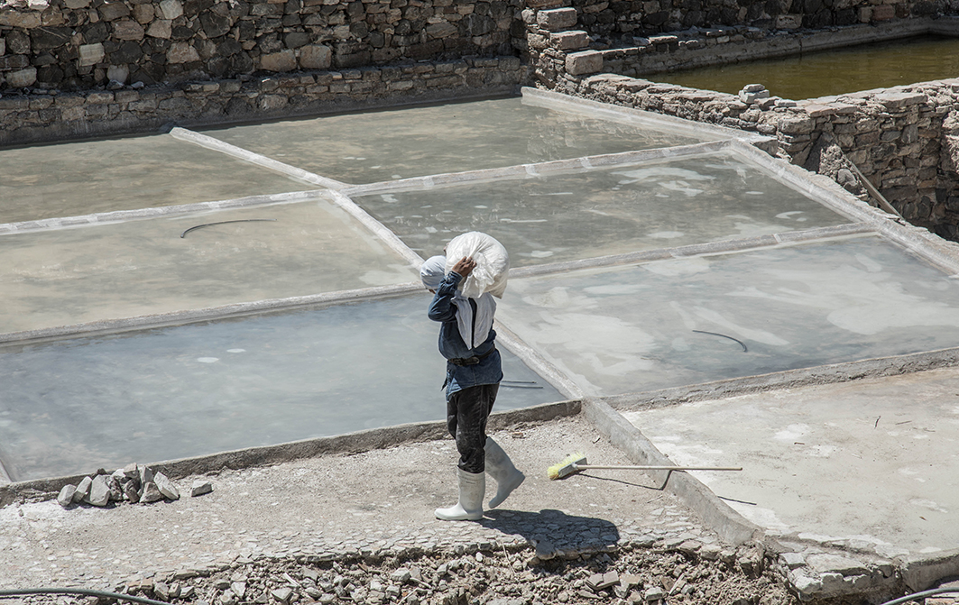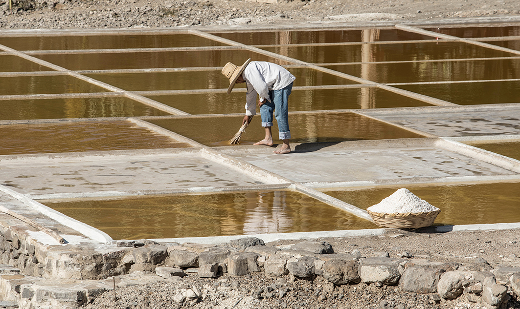 Es así que desde varios puntos, inlcuso desde la carretera antes de llegar al pueblo, se pueden ver las particulares construcciones de piedra en forma de terrazas, conocidas como salinas de interior o manantiales, que son cuadrículas con divisiones para contener una cierta cantidad de agua y que no son muy profundas para que pueda darse el proceso de evaporación. El proceso de elaboración de la sal es bastante complejo por los diferentes pasos de “lavado” que implican repeticiones que parecieran absurdas. Y digo que es un proceso complejo, no porque haya mucha maquinaria, sino por el conocimiento alquímico de esta gente que labora bajo el sol, y de manera totalmente artesanal, la sal exquisita que es exportada a varios países para su uso en cocinas gourmet.