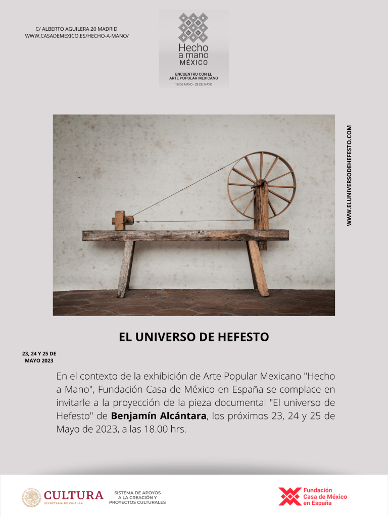 Proyecciones de la pieza documental «El universo de Hefesto», en el contexto de la exhibición de Arte Popular Mexicano «Hecho a mano», en la Casa de la Cultura de México en España. Madrid, España, Mayo, 2023.